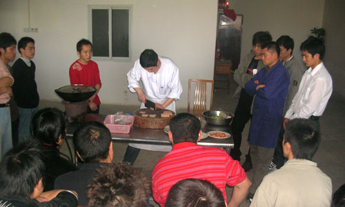 2009年4月18日,江徽公司本年度廚師技能培訓(xùn)班在總部開(kāi)班,來(lái)自公司各經(jīng)營(yíng)點(diǎn)近30名青年廚師們報(bào)名參加此次培訓(xùn),他們分別是:寧波中學(xué)白鶴餐廳江先進(jìn)、張飛、楊飛、李正好、鄒細(xì)雄、段艷兵、張積圣,萬(wàn)三餐廳周剛龍、賈龍、趙友鑫、楊紅濤、儲(chǔ)敏、李亞濤,慈湖中學(xué)餐廳徐華根、王波、汪杰、涂友清、王詩(shī)南,鄞高餐廳孫啟凱、張德君、李意成,新明達(dá)餐廳桂煒,東錢(qián)湖餐廳盛濤、丁勝、倪新桃,機(jī)場(chǎng)餐廳葉利華、黃小雷、江小寶等。寧波市旅游培訓(xùn)中心派陳老師親自上門(mén)授課。