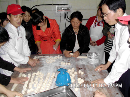 11月17日下午,寧波市江徽美食餐飲有限公司在萬(wàn)里學(xué)院第三餐廳舉行11月份面點(diǎn)培訓(xùn)與交流活動(dòng),此次活動(dòng)主要圍繞煎包和油條制作開(kāi)展。活動(dòng)中王師傅對(duì)油條配方、油條面制作、搟面、下鍋等操作要點(diǎn)作了詳細(xì)的說(shuō)明,并現(xiàn)場(chǎng)制作油條。很多面點(diǎn)師傅也現(xiàn)場(chǎng)進(jìn)行實(shí)際操作,并與王師傅深入地交流了經(jīng)驗(yàn)。